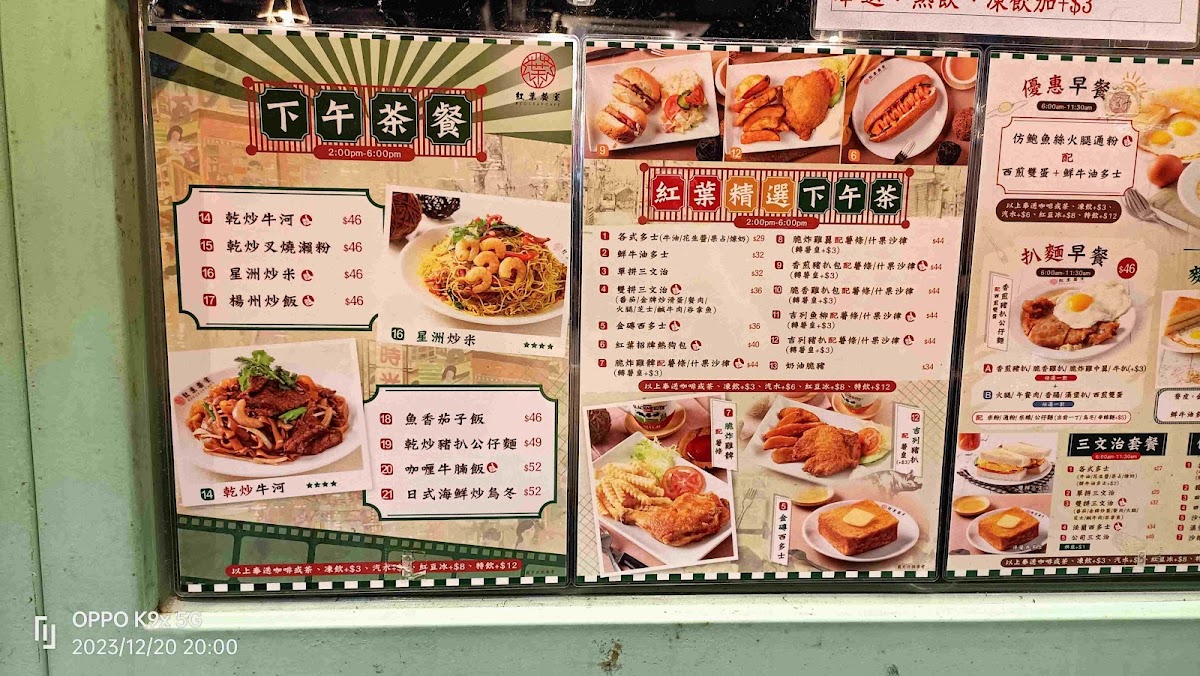 Red Leaf Cafe is well-known for its extensive menu of delicious offerings, crafted to satisfy your cravings at any time of the day. Breakfast is a standout experience here, with the classic 經典紅葉早餐 served from 6:00 am to 11:30 am. The 五香肉丁粉麵早餐 (HK$46) is a local favorite, featuring silky noodles topped with savory marinated pork, fluffy scrambled eggs, and crispy Danish toast—all accompanied by a refreshing drink to kick-start your day. If you prefer a lighter start, the 雙拼三文治早餐 is a delightful option that allows you to mix and match fillings, making it a versatile choice for all palates.